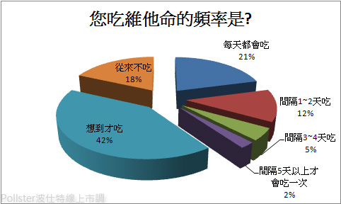 雖然數據如此,到底現代人吃維他命的習慣又是如何?Pollster波仕特線上市調﹝http://www.pollster.com.tw﹞在12/4就針對了「請問您吃維他命的頻率是?」進行調查,結果顯示有41.7%的受訪者表示「想到才吃」比例最高,其次是「每天都會吃」占了20.8%,「從來不吃」位居第三有18.2%,另外則是「間隔1-2吃」占了12.3%,「間隔3-4天吃」4.6%,「間隔5天以上才會吃一次」則有2.3%。由此可知,現代人雖然愛吃維他命,但是通常都是「吃心安的」,因為維他命通常要天天吃才能持續維持身體機能,「想到才吃」只是心態作祟,認為累了吃點維他命B、牙齦流血就吞維他命C,只能治標無法治本。