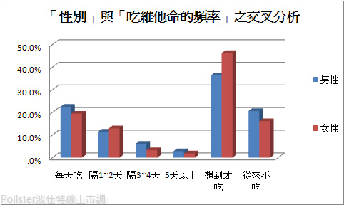 從性別分析則發現,男性族群「每天吃」維他命的比例比女性高出許多﹝男性22.5%,女性19.5%﹞,女性則是「想到才吃」比例比男性高﹝男性36.4%,女性46.3%﹞。因為男性通常工作會比女性來得操勞,因為包括許多的體力勞動工作等等,為了能夠保持良好體力應付工作,當然比較會記得每天吃維他命維持身體營養均衡。