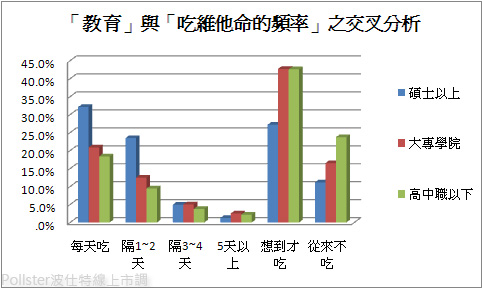 若從學歷上進行分析,碩士以上的族群「每天吃」維他命的比例,高於其他學歷(碩士以上32.1%,大專院校20.9%,高中職以下18.3%),「每隔1-2天吃」比例也高於其他學歷。原因就在於,碩士以上族群在工作上,通常都是進行需要長時間動腦或者小主管的職務,一整天下來腦力與體力的雙重消耗下,讓碩士以上學歷的族群身體更需要大量的營養及維生素,因此在缺乏的時候,當然會更依賴維他命來補充營養。