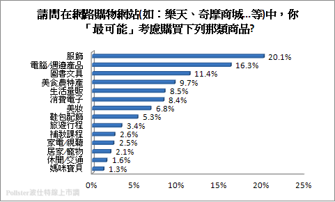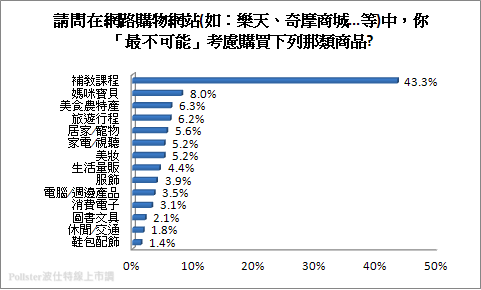 根據調查,有兩成的受訪者「最可能」在網路購物網站購買「服飾」,除了無法試穿之外,尺寸、花樣及種類繁多,到處逛只需要動動手指即可,可以省去很多時間及精力,所以最多人喜歡在網路購買服飾產品。一成六的人選擇「電腦∕週邊產品」,由於此部分商品需求很多,在網路上選擇和比價比實體店面更為方便,所以也非常多人會在網路購買此類商品。而「最不可能」在網路購物網站購買的商品是「補教課程」,佔有四成三,由於這是屬於金額較大的一項消費,而且內容是否符合需求也需要試聽看看,所以大多數人較不可能貿然直接在網路上購買。
