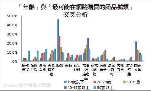 年齡層的不同,會在網路購物網站購買的商品也有不同。越年長者,尤其「40-49歲」的中年族群,有高達兩成五的人會在網路上購買「電腦∕週邊產品」,也許在網路上比價及選購這類商品比直接到電腦賣場購買更為方便,而且對於體力逐漸下降、生活忙碌的此年齡層的人來說,既省時又省力。而年紀越輕,會在網路上購買「圖書文具」的比例越高,尤其「19歲以下(21.2%)」的青少年,由於還在求學階段,對於圖書文具的消耗量較大,所以在網站上購買的機率也相對較高。