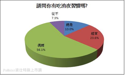 http://www.pollster.com.tw)在2012/4/10就針對吃宵夜等相關問題進行網路民調,首先詢問「請問你有吃消夜習慣嗎?(晚上八點以後進食就算)」調查結果顯示超過半數的民眾表示「偶爾」,占56.1%的比例,「經常」吃宵夜的民眾則是占23.6%的數據、「總是」吃宵夜者則是拿下13.0%的比例,相對表示「從不」吃宵夜者僅有占7.3%的數據。由此可以看出只有不到一成的民眾能夠嚴加控制,從來不會吃消夜,另外約九成的民眾則會偶爾、經常或總是有吃消夜的習慣。