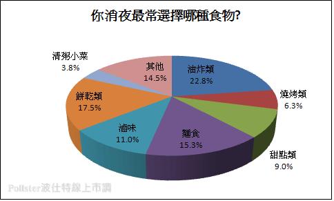 進一步調查「請問你消夜最常選擇哪種食物?」,結果顯示22.8%的受訪者表示「油炸類」的食物,17.5%的民眾則是選擇「餅乾類」,另外會吃「麵食」類的受訪者則是占15.3%的比例。可以看出炸地酥酥脆脆的油炸類食物還是最獲國人青睞,成為吃消夜的首選。