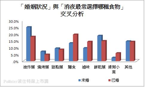 「婚姻狀況」與「消夜最常選擇哪種食物」交叉分析則可以看出「未婚」者相對「已婚」者對於「油炸類」的宵夜特別有興趣,因此在此選項占25.1%的比例,「已婚」者在此相對只有占18.0%的數據,不過在選擇「麵食」及「滷味」類的消夜,「已婚」者都比「未婚」者占相對較高的比例,可以推敲「已婚」者在吃宵夜時還是會較避免油脂高的食物為考量,以相對清淡及低油脂為消夜選擇。