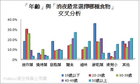 不同年齡分析則可以發現偏愛「油炸類」消夜的年齡層集中在「39歲以下」者,尤其是「20-29歲」此一年齡層,比例高達29.7%的數據,「50歲以上」年長者在此選項相對僅有占2.9%的比例。對「餅乾類」及「甜點類」最情有獨鍾的年齡層相對集中在「19歲以下」者,至於選擇「滷味」、「麵食」及「清粥小菜」則是較集中於「50歲以上」年長者。可以了解不同年齡層對於消夜的選擇相對有不同的考量;年輕族群相對偏愛高油脂食物,而年長者則選擇消夜會較偏向清淡類的食物。