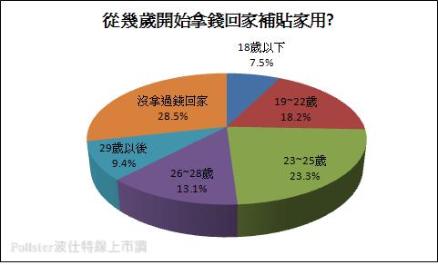 一般人都從幾歲開始會拿錢回家貼補家用呢?結果發現有28.5%表示「沒拿過錢回家」,其次是「23-25歲」有23.3%,第三則是「19-22歲」18.2%,「26-28歲」則以13.1%位居第四,最後則是「29歲以後」佔了9.4%。雖然有將近三成沒拿錢回家,多數剛出社會23-25歲拿錢回家貼補家用的比例也算滿高的,因為社會新鮮人尚未成家,「一人飽等於全家飽」的情況下,比較能夠額外負擔家計,等到年紀愈大成家立業後,拿錢回去的比例就逐漸變少了。