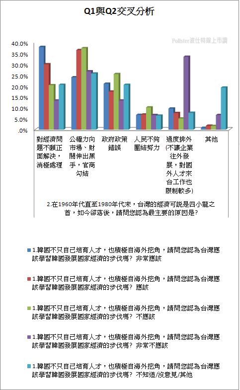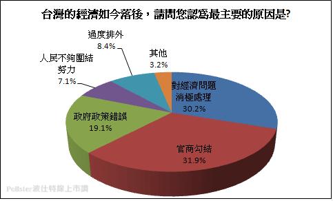 對於台灣經濟發展逐漸下滑的原因,波仕特線上市調網同樣做了下列問題調查,「在1960年代直至1980年代末,台灣的經濟可說是四小龍之首,如今卻落後,請問您認為最主要的原因是?」30.2%國人認為是政府對於對經濟問題不願正面解決、消極處理,31.9%國人認為公權力向市場、財閥伸出黑手,官商勾結,19.1%國人認為是政府決策錯誤。