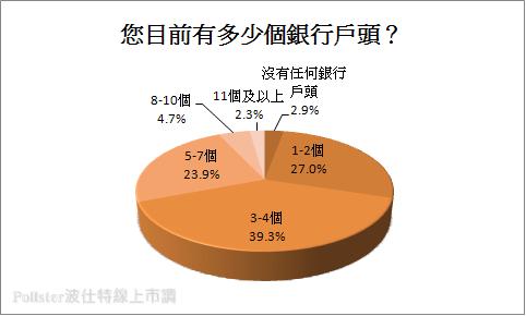根據中華民國銀行公會統計,全台銀行戶頭約有3000萬靜止戶,存款總額可能達300億元,請問您目前有多少個銀行戶頭?調查結果顯示多數民眾擁有「3-4個」戶頭,占39.3%的比例,其次27.0%的民眾則是有「1-2個」戶頭,排名第三,23.9%的民眾目前則是有「5-7個」戶頭,另外表示有「8-10個」、「沒有任何銀行戶頭」及「11個及以上」者則分別各占4.7%、2.9%和2.3%的比例。