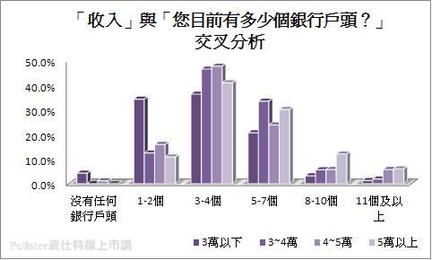 從不同收入及學歷進行分析可以大致歸納其趨勢為學歷愈高相對來說所擁有的戶頭有較多的傾向,像是學歷碩士以上者有5個以上銀行戶頭,所占比例皆高於其他學歷者,同樣地收入愈多也呈現出相對應的情況,所擁有的戶頭也相對較多,收入5萬以上者表示擁有8個戶頭以上皆高於其他月收入者。