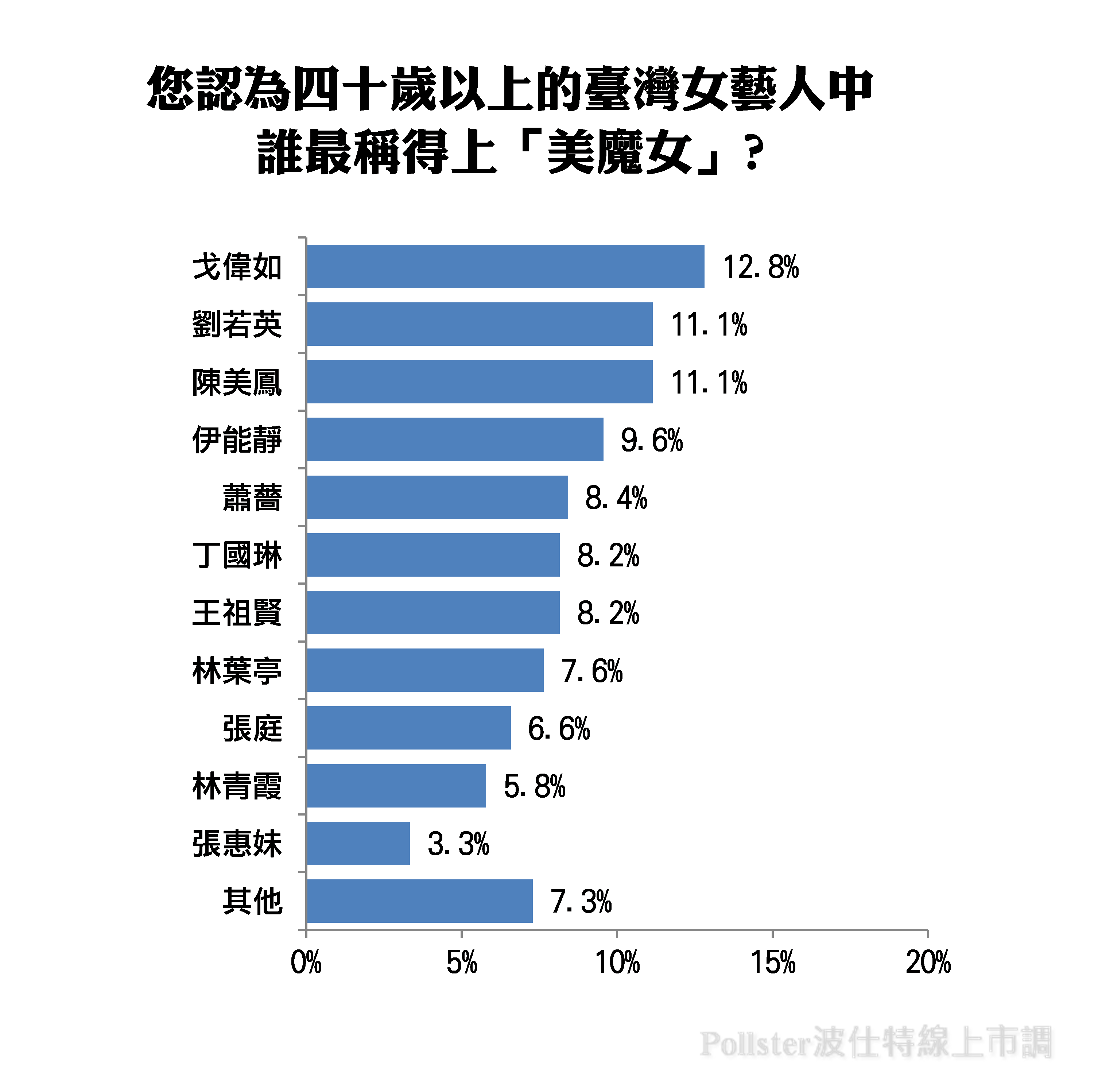 根據Pollster波仕特即時線上市調網所做的「您認為四十歲以上的臺灣女藝人中誰最稱得上『美魔女』?」所做的調查結果:選擇「戈偉如」者最多,為整體受訪者之12.8%;「陳美鳳」與「劉若英」以11.1%並列第二;之後依序為「伊能靜」9.6%;「蕭薔」8.4%;「王祖賢」與「丁國琳」8.2%;「林葉亭」7.6%;「張庭」6.6%;「林青霞」5.8%;「張惠妹」3.3%;而選擇「其他」則是約占7.3%。