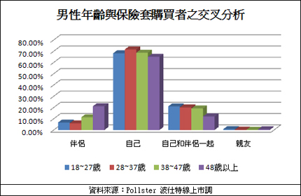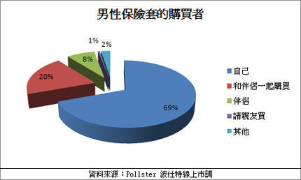 波仕特線上市調網(http://www.pollster.com.tw)針對18~65歲有使用保險套習慣的男性會員進行網路民調,了解「保險套主要購買者為何者」,多數的受訪者表示通常是「自己」去購買保險套,占全體受訪者的69.42%;其次是19.91%的受訪者表示是「跟伴侶一起」去購買,而通常由「伴侶」購買保險套的比例占7.68%,排名第三。