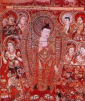 第33 窟後壁,有一幅表現佛涅槃後眾弟子默立舉哀的致意圖。