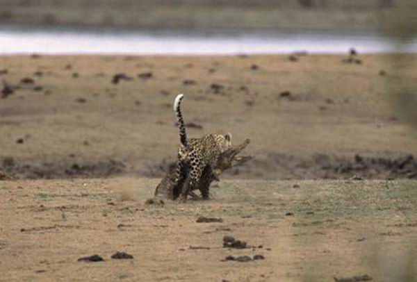 美國野外攝影師hal brindley在南非的kruger國家公園拍到一隻獵豹攻擊鱷魚的瞬間,