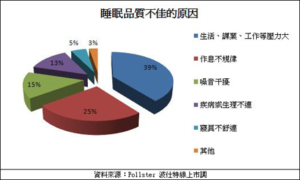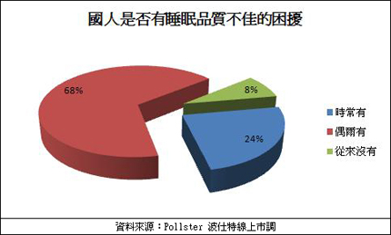 根據波仕特線上市調網(http://www.pollster.com.tw)與薪能量教育學院(http://tw.myblog.yahoo.com/xin-energy)聯名做了三項調查,分別就「您有睡眠品質不好的困擾嗎?」、「造成睡眠品質不佳的原因」以及「如何解決睡眠的問題」來交叉分析國人睡眠品質不佳的原因以及解決之道。這份研究資料的調查時間為2009/05/22~2009/05/25,回收有效樣本9,954份,其中24.35%的民眾「時常有」這樣的困擾,高達六成以上,也就是67.44%的民眾「偶而有」失眠的情況。只有不到一成的人「完全沒有」失眠的情況發生。