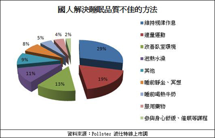 再進一步分析,造成睡眠品質不佳的原因的選項裡以「生活、課業、工作等壓力大」奪冠,占了39.43%;接著是「作息不規律」25.55%、「噪音干擾」14.68%、「疾病或生理不適」12.92%,有此可知影響睡眠的原因最主要還是來自於心理因素,「壓力」才是造成國人失眠的導火線。該如何解決睡眠的問題,Pollster波仕特線上市調也做了幾種選項提供問卷調查,其中「維持規律作息」最受重視,有28.97%的人選擇此種方式避免失眠;然後「適量運動」18.73%、「改善臥室環境」是第三高選項,占有12.96%;「泡熱水澡」11.2%也是不賴的選擇。