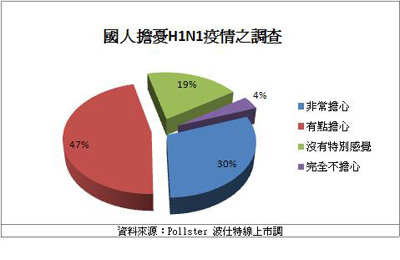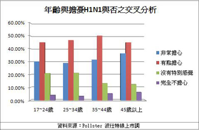 調查中發現,年齡較大的受訪者,超過八成都是擔心H1N1會迅速擴散﹝35-44歲非常擔心31.62%,有點擔心50.14%,總合81.76%;45歲以上非常擔心36.43%,有點擔心44.96%,總合81.39%﹞,而相對於較年輕的受訪者,「沒有特別感覺」的比例就明顯偏高。