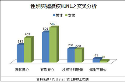 根據調查數據可以發現,雖然無論男性女性對於H1N1是否會蔓延擴散都抱持著擔心的態度,但是女性尤其擔憂,男性非常擔心的比例是26.91%,有點擔心佔46.97%,總合約佔73.88%;女性非常擔心就佔了33.01%,有點擔心佔46.97%,總合79.98%,不僅「非常擔心」比例遠遠高出男性,總合也是超越男性受訪者。