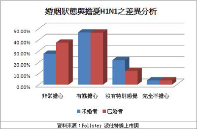 若從婚姻狀況來做分析,未婚者非常擔心的佔27.61%,有點擔心者佔46.64%,總合74.25%;已婚者非常擔心佔37.50%,有點擔心佔46.50%,總合為84%,由此可知已婚受訪者擔心的比例,也高於未婚的受訪者,原因可能在於已婚者有了孩子,所以更擔心H1N1對下一代的威脅。