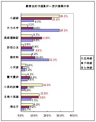 調查資料分析中顯示:整體而言有19%的網友認為「大力水手」是最懷念的卡通、其次是17.2%的「小甜甜」,另外有15.7%的網友則是「頑皮豹」。以世代差異進行分析,結果更是明顯不同。五年級網友票選前三名最懷念的卡通分別是小甜甜佔29.1%、小英的故事16.3%、與北海小英雄佔13.8%;六年級網友的投票結果依序則是小甜甜23.2%、湯姆歷險記15.8%、北海小英雄13.0%;七年級的投票結果明顯有別於五六年級,前三名最懷念的卡通影片依序分別是大力水手29.1%、頑皮豹21.1%、莎拉公主9.8%。可看出在五六年級世代間是以小甜甜與北海小英雄最受歡迎,與年輕的七年級世代完全不同,莎拉公主也比小甜甜更受七年級世代的歡迎。