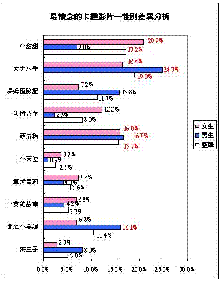 另外以性別差異分析調查結果顯示:男性網友最懷念的卡通與女性網友的票投結果也不同,男生以大力水手、頑皮豹與北海小英雄為票投的前三名,分別各佔24.7%、16.7%與16.1%的比例。女性票投最懷念的卡通影片前三名則分別是小甜甜20.9%、大力水手16.4%與頑皮豹16.0%;而從下表資料中也顯示頑皮豹則是較不受男女性別差異影響喜好的卡通影片。