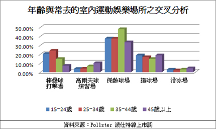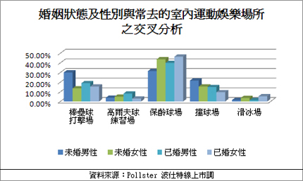 近日,波仕特線上市調網(http://www.pollster.com.tw)進行一項「常去的室內運動娛樂場類型」網路民調,詢問受訪者「最常去的室內運動娛樂場所為何?」。調查結果發現,受訪者回答「保齡球場」的比例最高,達38.75%,其次為「棒壘球打擊場」(20.76%)、「撞球場」(17.29%)、「高爾夫球練習場」(4.58%)及「滑冰場」(2.64%)。從數據來看,一般民眾最常去「保齡球場」,而近年來受職棒風潮、棒球運動推廣影響,選擇「棒壘球打擊場」的比例也節節上升,緊追在後。