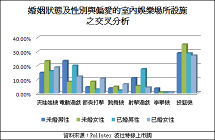 從婚姻狀態看來,未婚女性最喜歡的設施為「夾娃娃機」以及「投籃機」,而已婚女性則偏愛重節奏的「節奏打擊機」以及「跳舞機」;至於未婚男性大多選擇的娛樂設施則為「電動遊戲」和「拳擊機」,而已婚男性則較偏愛具攻擊性的「射擊遊戲機」。