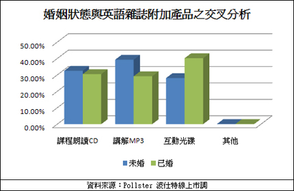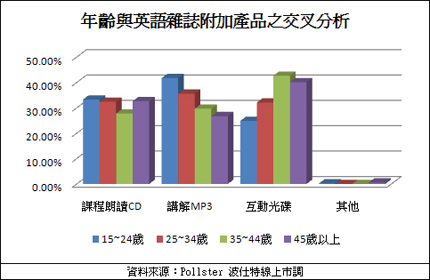 波仕特線上市調網(http://www.pollster.com.tw)在8/31~9/2針對「除了當月英語雜誌外,請問您會選購以下哪種當月雜誌的附加產品?」進行網路民調,結果發現選擇「講解MP3」的比例最高,占了36.90%,其次為「課程朗讀CD」32.13%,第三位則是「互動光碟」30.86%。這樣的結果可以證實,多數民眾學習英語認為「讀寫」會比「說」來的重要。民眾最需要的是有關於雜誌本身的文章講解,因為這樣可以省去自己查詢字典或者文法的時間,增加本身閱讀的速度。至於聽朗讀知道正確發音,則是在讀跟寫都會了之後再學習。