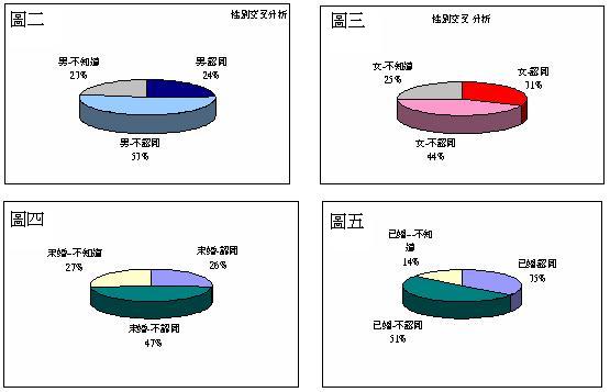 此項調查受訪者中有48%的人不認同這句話,他們認為「結婚不是愛情的墳墓」,只有28%的受訪者認為「結婚是愛情的墳墓」,此外有24%的受訪者不表示意見(圖一)。再者,從性別交叉分析來看(圖二、三),有31%女性受訪者認同「結婚是愛情的墳墓」,44%表示反對,25%不表示意見(圖三);另一方面男性受訪者中有則有24%表示認同,53%表示反對,23%不表示意見(圖二);從婚姻狀態來看(圖四、五),未婚的人口中,有26%受訪者認同「結婚是愛情的墳墓」,47%表示反對,27%不表示意見(圖四);而已婚人口中有35%受訪者表示認同,51%表示反對,只有14%不表示意見(圖五)。