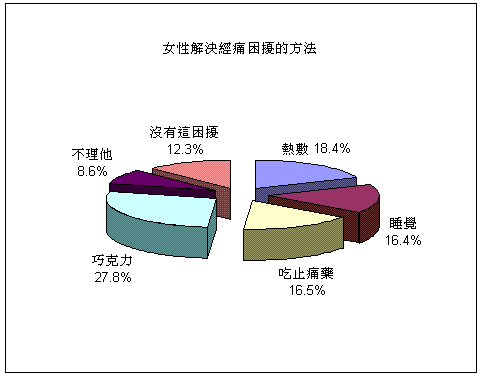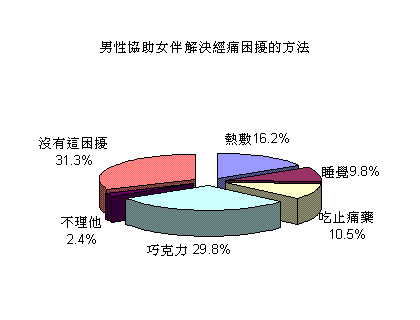 根據波仕特線上市調網對『如何解決經痛困擾的方法』進行調查,其中16歲至45歲女性網友的整體資料分析顯示:有87.7%的女性在每個月好朋友來的時期都有經痛困擾,其中有27.8%的女生們以吃巧克力或喝熱巧克力、18.4%女生以熱敷、16.5%女生以吃止痛藥的方式解決經痛困擾;另外16.4%女生以睡覺來解決經痛、有8.6%女生選擇不理會它,只有12.3%的女生表示無此困擾。另外針對男生看到身旁女性因為經痛而不舒服時會給予何種協助的分析,資料顯示有29.8%的男生表示會買巧克力給女生吃、16.2%的人會幫忙熱敷以及10.5%的男生會購買止痛藥給女生吃來降低經痛不舒服的症狀。