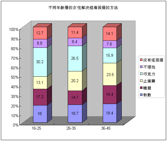 而年齡層來分析不同年齡層的女生處理經痛困擾的方式,分析資料顯示16-25歲的受訪者有30.2%主要以吃巧克力或喝熱巧克力、18%受訪者以熱敷、17.2%受訪者以吃止痛藥的方式解決經痛困擾;而26-35歲的受訪者則是有26.5%主要以吃巧克力或喝熱巧克力、20.2%以吃止痛藥的方式、18.7%受訪者以熱敷來經痛困擾;36歲以上熟女則是23.5%受訪者以吃止痛藥的方式、19.4%受訪者以熱敷或睡覺方式、15.9%受訪者會吃巧克力或喝熱巧克力來解決經痛困擾。