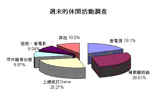 波仕特線上市調網針對線上網友週末最常做的休閒活動項目進行線上調查,結果發現在6008位受訪者中,有28.61%的受訪者表示週末最常做的休閒活動是「補眠睡到飽」,其次25.27%的受訪者表示是「上網或是打GAME」、另有18.1%表示看「電視」是最常在週末進行的休閑活動;另外有9.04%受訪者會在週末「逛街看電影」、8.97%受訪者會選擇「到郊外踏青出遊」作為週末的休閒活動;也有另外約10%的受訪者則是選擇其他如:上健身房、看書聽音樂等作為休閒活動。