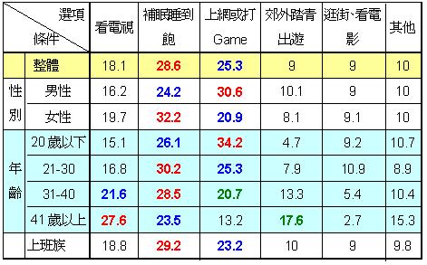 、補眠睡到飽(23.5%)、郊外踏青(17.6%)上網或打GAME(13.2%)、逛街看電影(2.7%)。