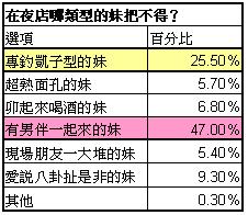 在夜店中除了聽音樂、喝喝小酒聊聊天外,也有不少身材姣好的辣妹吸引眾人目光,如何在夜店中能認識辣妹成功?有36%的受訪者認為幽默的話題搭訕是最主要的把妹妙招,最能吸引異性的注意;其次17.6%受訪者則是認為從認識的朋友牽拖關係,能成功的搭訕心儀的對象。另外,除了辣妹人人想認識外,在夜店中也有絕對碰不得的對象類型,在調查中有47%的受訪者認為「有男伴一起來的女生」是絕對碰不得的,以免造成爭風吃醋的暴力事件或是引起後續擺脫不了的噩夢連連。其次25.5%受訪者認為「專吊凱子的女性」也碰不得,免的沾惹上吸血鬼,得不償失。