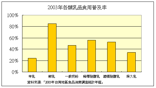 鮮乳是國人主要乳品的飲用來源,除了提供豐富且優良的蛋白質、維生素、脂肪..等,更可以提供正常成人每日鈣質的攝取量。根據以下資料分析可以看出整體乳品的使用率,除了國人飲用習慣的因素外,不難看出消費者對於鮮乳的需求程度。研究顯示,國人選購鮮乳最重視因素仍然以新鮮度佔第一位,其次為衛生、品牌、價格合理、廣告宣傳…等。