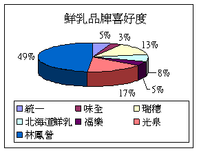 至於大家偏好喝什麼品牌的鮮乳呢?『波仕特線上市調網』也以18-50歲的學生、上班族群等為調查對象,調查時間為2006/08/23-24,共累計834份有效問卷。調查發現,受訪者對於林鳳營鮮乳的喜好程度高達49%佔第一,光泉鮮乳17%、瑞穗鮮乳13%,分別排名第二及第三。