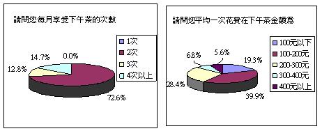 顯示出,21~45歲的上班族群中72%至少每個月平均有2-3次飲用下午茶的習慣,26-30歲受訪者也是享受下午茶比率最高者。消費的金額也以一般平價型的消費為主,100-300元之間的消費占70%。