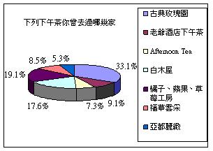 資料顯示,「你曾去過哪幾家下午茶中?」古典玫瑰園446人(33.1%)為最高,橘子、蘋果、草莓工房系列257人(19.1%)、白木屋237人(17.6%)居次。