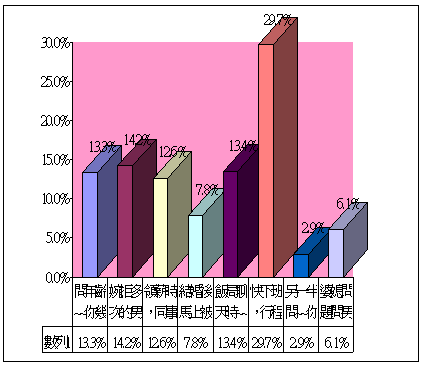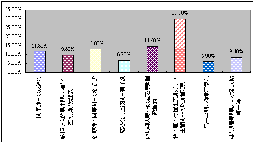 「小姐您幾歲?看起來好年輕呀!」、「您是支持哪個黨派的?」、「xxx,客戶案子要趕,今天要加班喔!」……,生活上總有些避免不了的問題充斥在人際交往中,不管是陌生人初次交談、家庭親戚朋友之間的對話…,甚至是工作上的應酬場合,人與人之間在交談時偶爾會遇到些「問者無心、聽者有意」之類的尷尬對話與不知該如何回應的窘境。波仕特線上市調網於2007/1/16~20071/18針對這種狀況特別進行一項趣味調查,結果顯示在2102位有效的受訪者中,有近三成的網友表示最討厭在近下班時聽到上司要求留下來繼續加班。