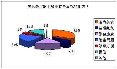 有34%的網友外出到餐館用餐時最重視餐館「店內美食」,餐點新鮮、豐富、美味才是吸引消費者上門的首要要素;店內提供的菜色越多,給消費者多重選擇的機會他們才會多次上門再次消費,當然,食物好吃是必要的!其次,衛生環境也是網友看重的地方,有23%的網友認為「衛生」是他們上餐館時最在意的要素!安全衛生指的是除了店內桌椅擺設、廁所都要乾淨之外,連同廚房內的工作人員、場外的服務人員都要有良好的衛生習慣,一家餐館若不衛生,食物再怎麼美味好吃也吸引不了顧客上門。此外,服務人員的「服務態度」也有19%的網友表示這是他們在選擇餐廳用餐時重視的地方,服務品質若不佳,用餐者的心情也會大受影響。 |