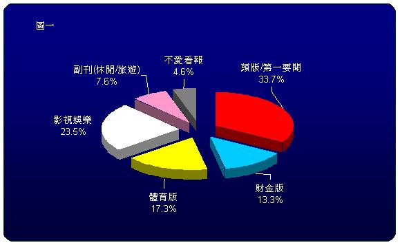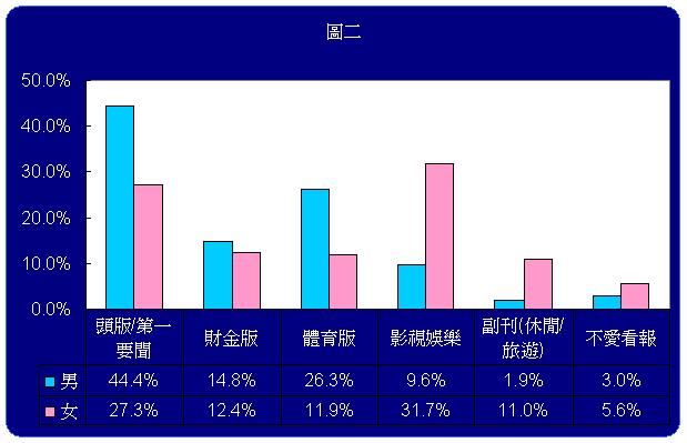 從性別差異觀察男、女閱報偏好習性的不同,則與一般印象沒有太大差異,從【圖二】可看出看報時首先翻閱「影視娛樂」與「副刊」兩版的女性比例高於男性,女性對「影視娛樂」、「副刊」較感興趣或較為注意,分別佔31.7%